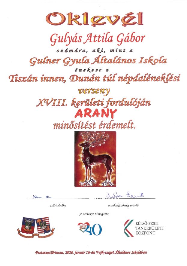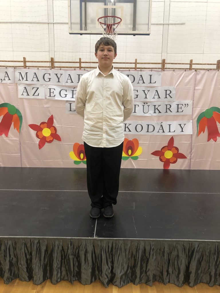 – Szóló kategóriában Gulyás Attila Gábor 7.b – arany minősítést kapott a széki asztali nótacsokrára.