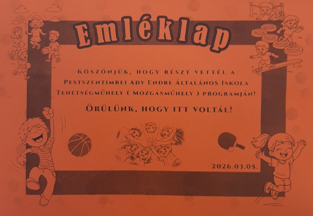 2026. március 5-én rendezték meg a pestszentimrei Ady Endre Általános Iskola Tehetségműhely sorozatának Mozgásműhely foglalkozását. Iskolánkat Agócs Erik, Jámbor István 4.a és Fodor Boldizsár, Vigh Dávid 4.b osztályos tanulóink képviselték. A gimnasztikus, táncos első rész után drámajátékos feladatok, illetve csapatjátékok következtek, amelyekbe beállhattak a kísérő pedagógusok is. A különböző iskolákból érkezett gyerekek összehangoltan, egymásra és a játékos feladatokra való figyelemmel ügyeskedtek. A foglalkozás végén terített asztal várta őket bőséges enni- és innivalóval. Gyerekek és felnőttek egyaránt nagyon jól érezték magukat ezen az igazán jó hangulatú és aktív délutánon. Ezúton is köszönjük az Ady Endre Általános Iskola pedagógusainak a szervezést, a lehetőséget!